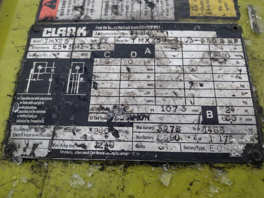 Located in Midland, MI Battery Powered Forklift Clark TM25 s/n TMX25031039803KF 36 Volt battery operated forklift. Removed from service to not having safety devices. Dow Unit FT 178 HOURS OF OPERATION: 7:00am - 5:30pm EST, Mon - Thurs Contact: David Callahan Office: (989) 633-0985 email: dcallahan@dow.com Sold As-Is, Where-Is Bidding Closes on Dow’s acceptance of a qualifying bid Sealed Bidding starts at $300 DOW RESERVES THE RIGHT TO REJECT ANY AND/OR ALL BIDS LOAD OUT: This lot will be loaded onto buyer's truck free of charge. Buyer is responsible for securing the load and logistics